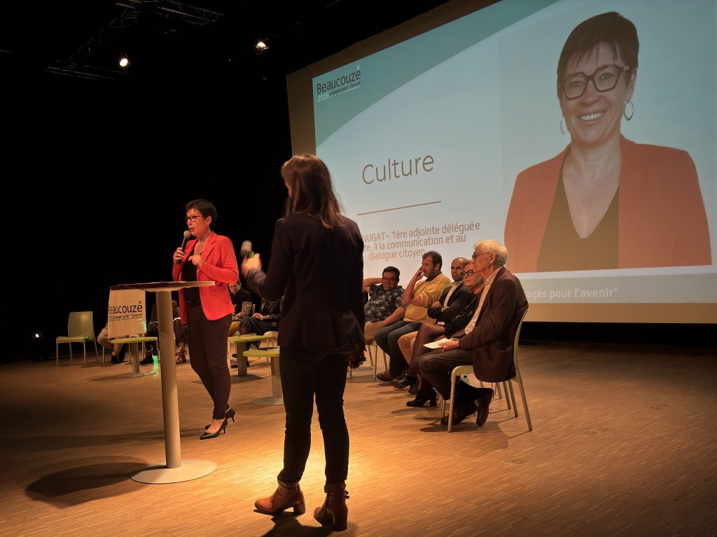 Animée par Aurélie Perard sur un système de questions réponses très dynamique, la soirée a débuté par l’intervention de Mickaël Lefeuvre, adjoint à l’urbanisme et à l’environnement qui a expliqué le développement de l’habitat inclusif ainsi que le projet de l’Office Foncier Solidaire. Ce dernier a pour but de permettre un accès à la propriété à des populations plus en difficulté, que cela soit des jeunes ou des personnes ayant peu de ressources financières. Pour Mickaël, le vivre ensemble passe par la mixité sociale. Un constat et des valeurs partagées par Peggy Massol, adjointe aux solidarités et aux Aînés, qui est revenue sur les temps forts de l’animation sociale du mandat notamment l’essor de la Couzette, le succès de la fête de la soupe et les repas des ainés. Des évènements appréciés des habitants qui permettent de lutter contre l’isolement et de recréer du lien entre les générations.